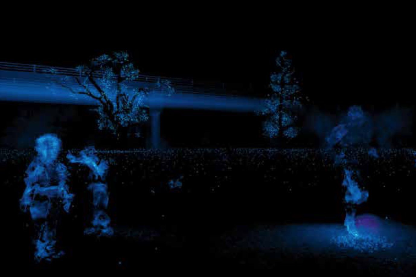 Les six lieux où l’on se rend comme si l’on était dans la peau de John et dont on se souvient dans le film, sont perceptible à 360°. Pour représenter la vision altérée de l’écrivain l’image a subi un traitement qui en a fait disparaitre les couleurs, ne laissant plus dans la nuit que des points fluorescents bleutés. Ces points s’intensifient et prennent l’épaisseur de corps fantômatiques au gré de notre mouvement oculaire ou physique vers la source des sons dans lesquels nous sommes immergés. Cette expérience tente de donner corps à la solitude de John, tandis que le film nous montre l’écrivain vu de l’extérieur, souvent confronté à la perception de ses proches, celle-ci évoluant d’année en année.